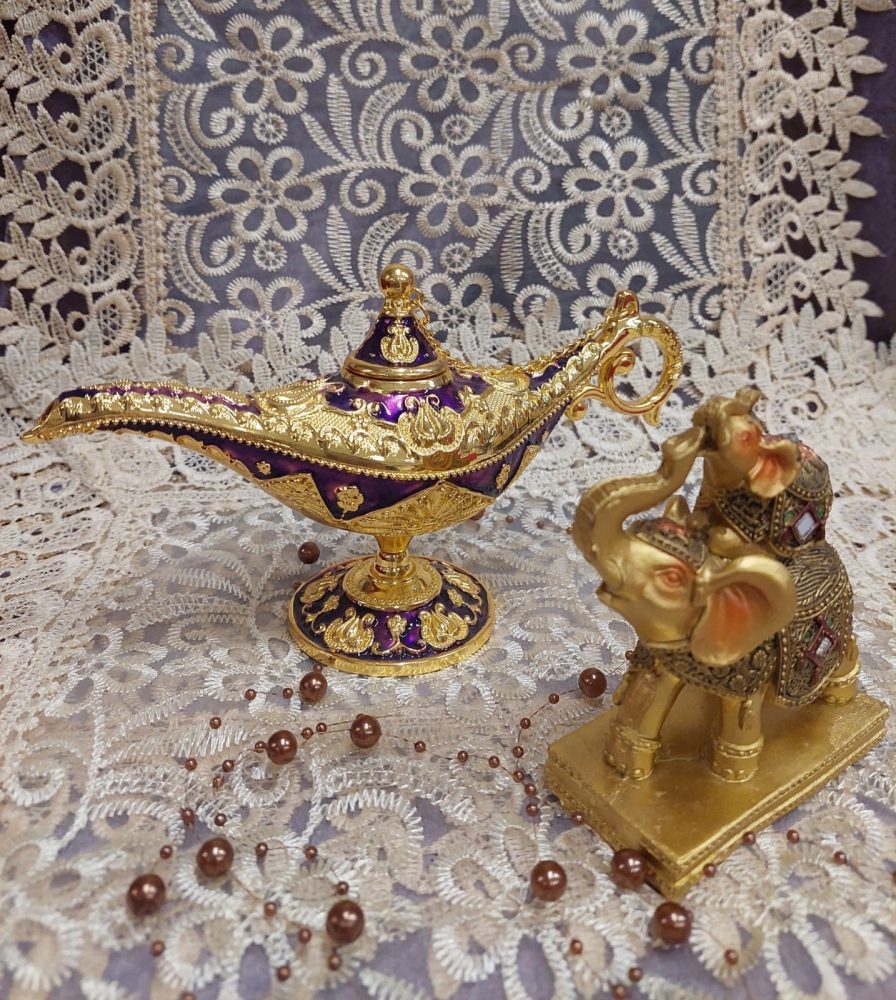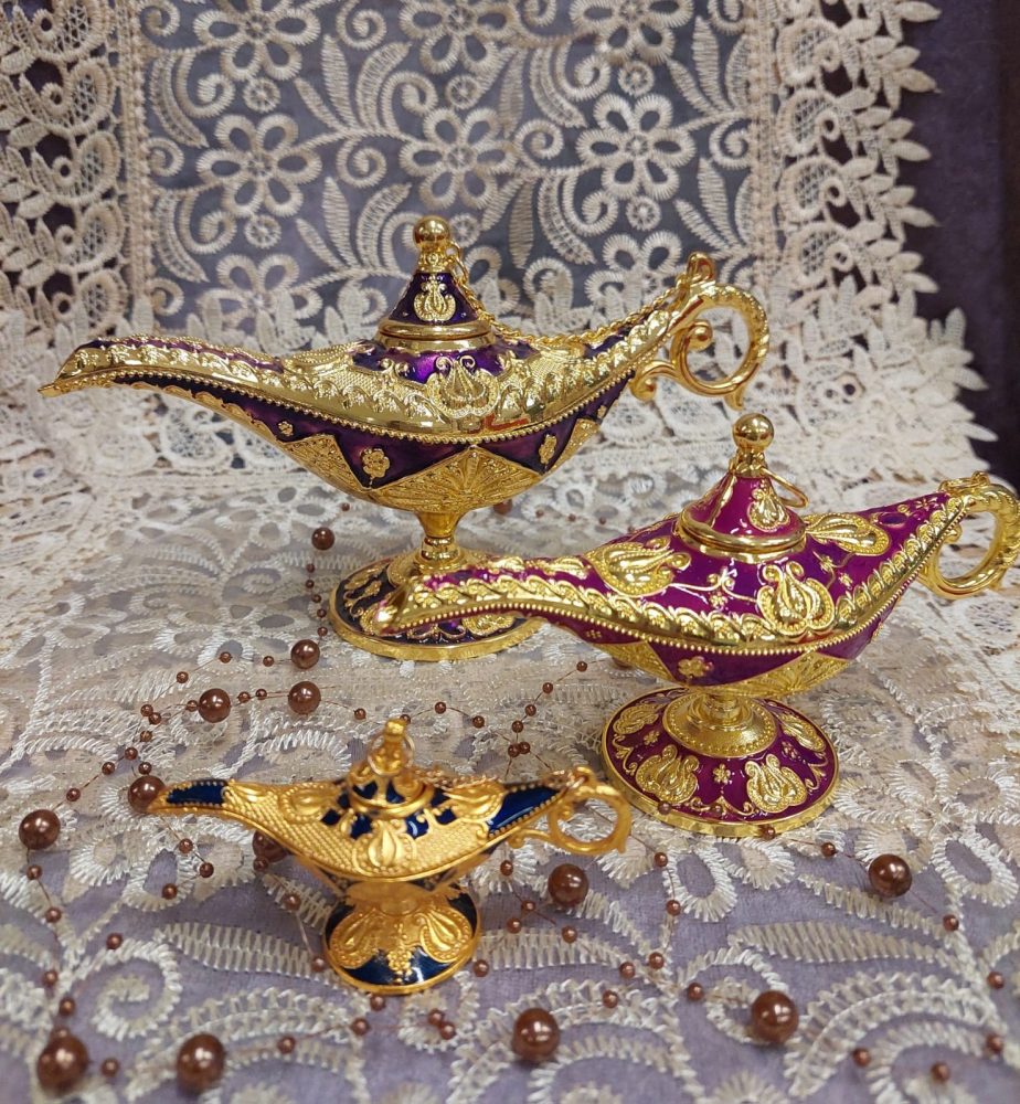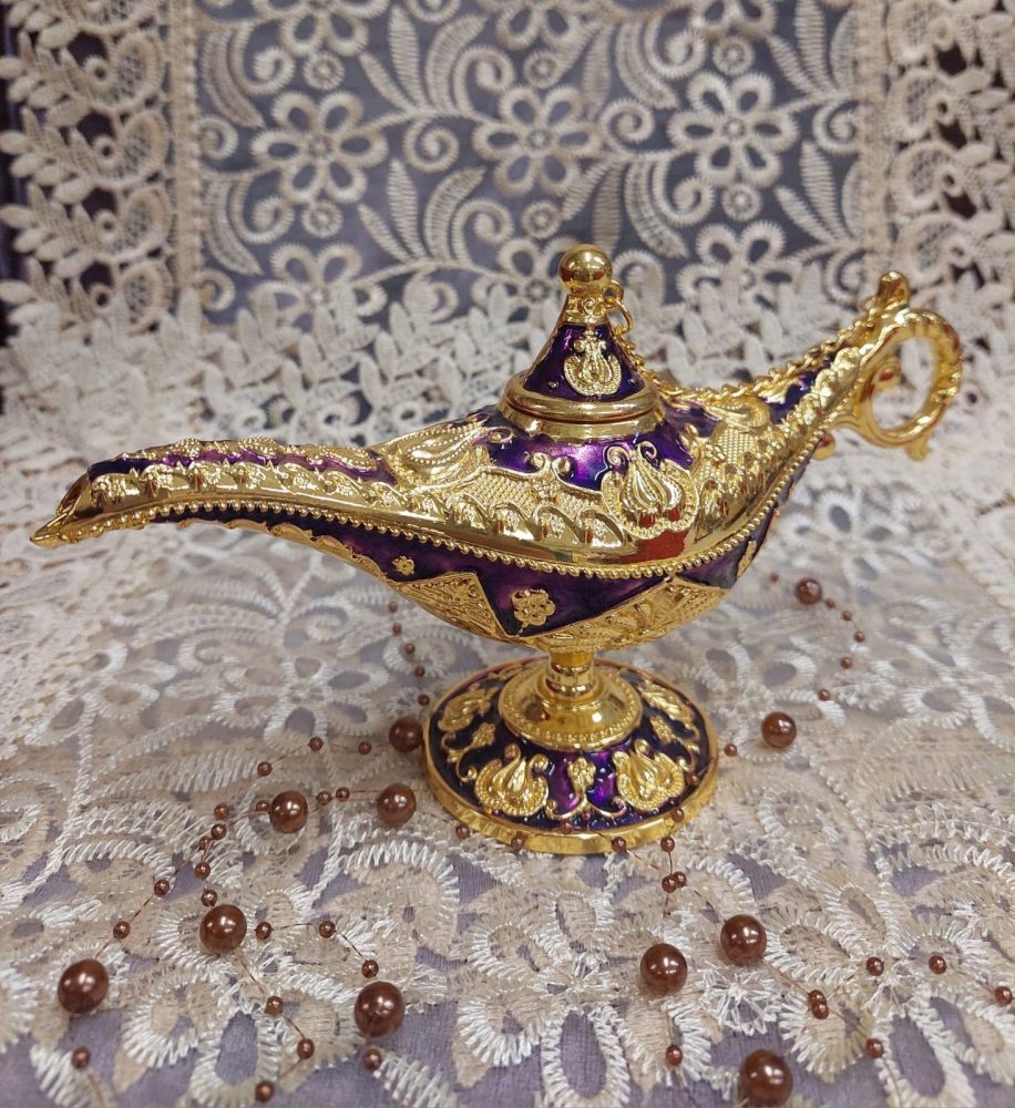 Violetti-kultaisen, isokokoisen Alladinin taikalampun mitat ovat n. 22 x 12 cm.