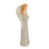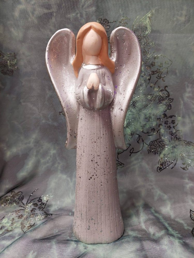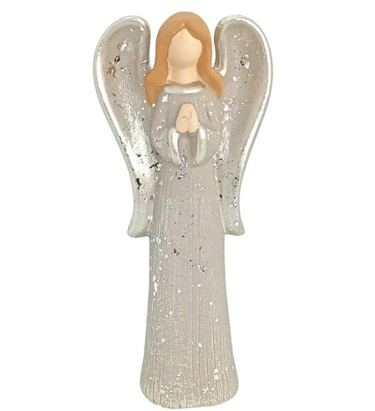 Kaunis, seisova enkeli kädet ristissä. Patinoitunut, hopeansävyinen väritys.