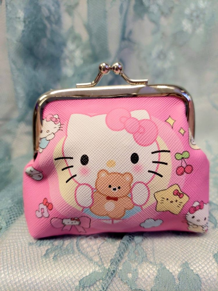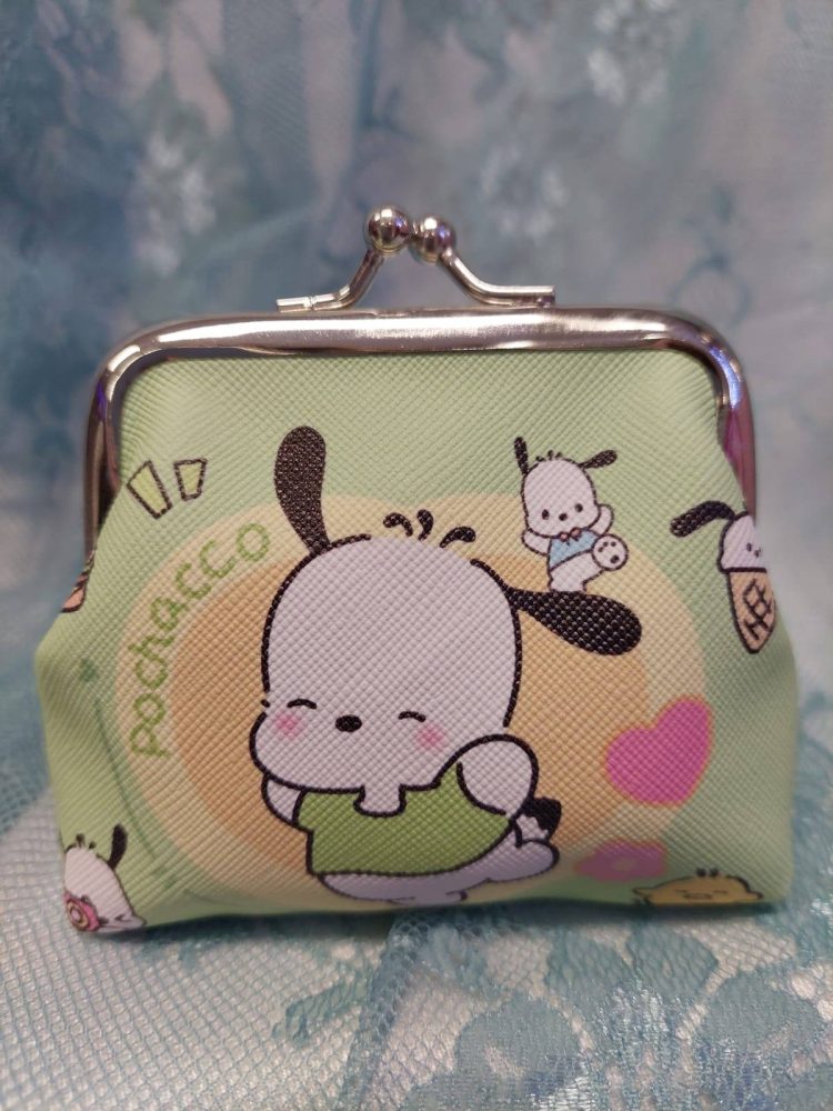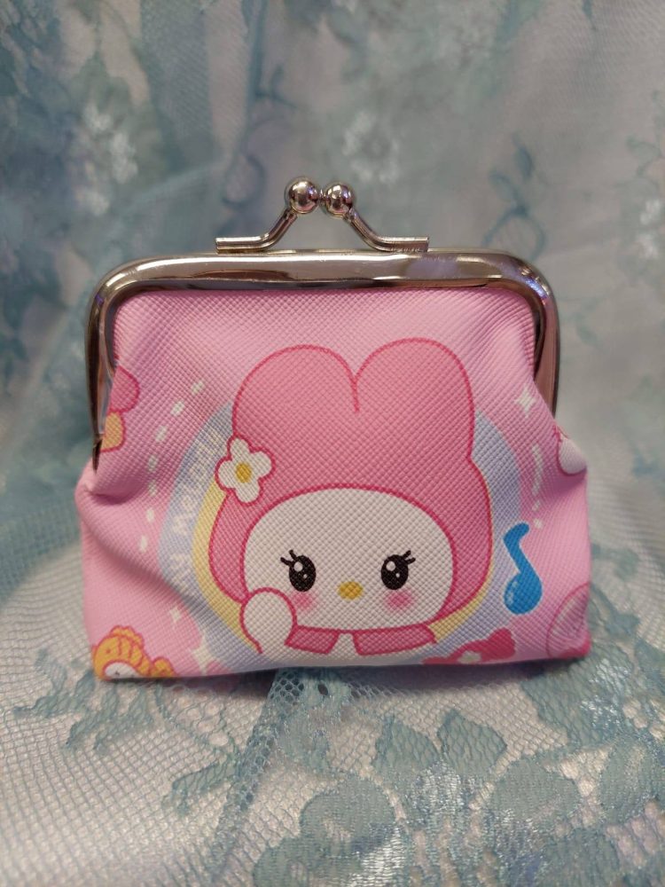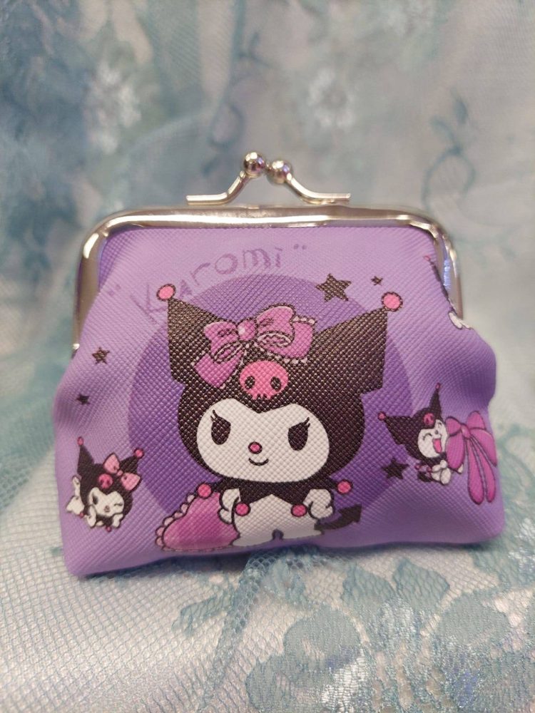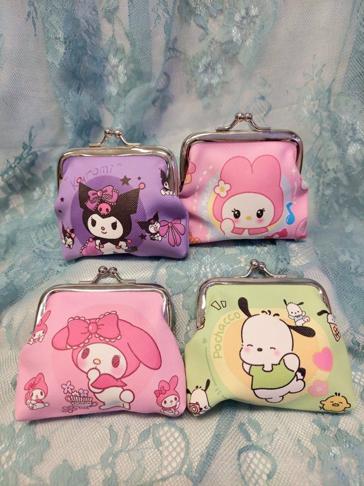 Kaunis sarjakuvahahmoilla koristeltu kolikkokukkaro kaikille tärkeille tavaroille.