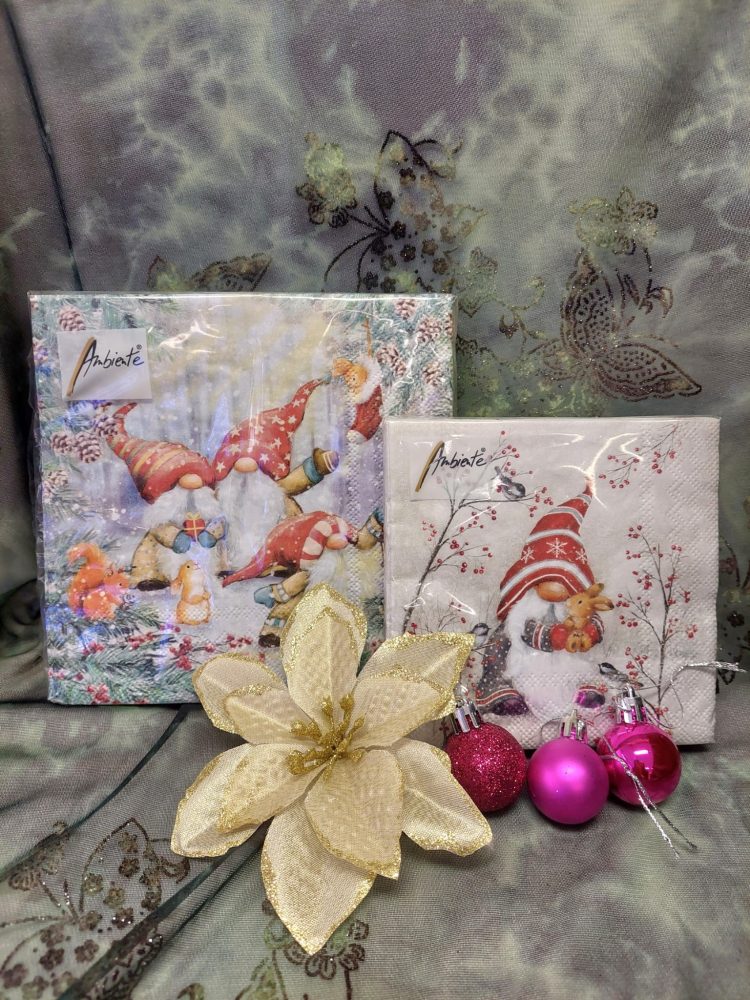 Ihastuttava jouluinen ruokapöydän servetti Tontut metsässä.