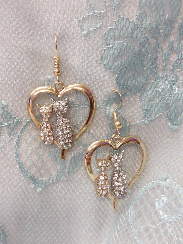 Kauniit korvakorut, timanttiset kissat sydämessä