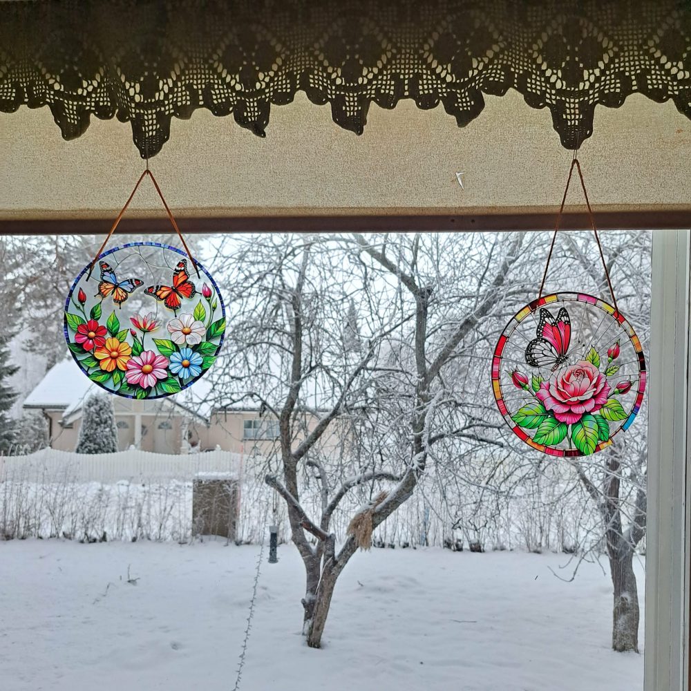 Ikkunakoriste on halkaisijaltaan noin 20 cm.