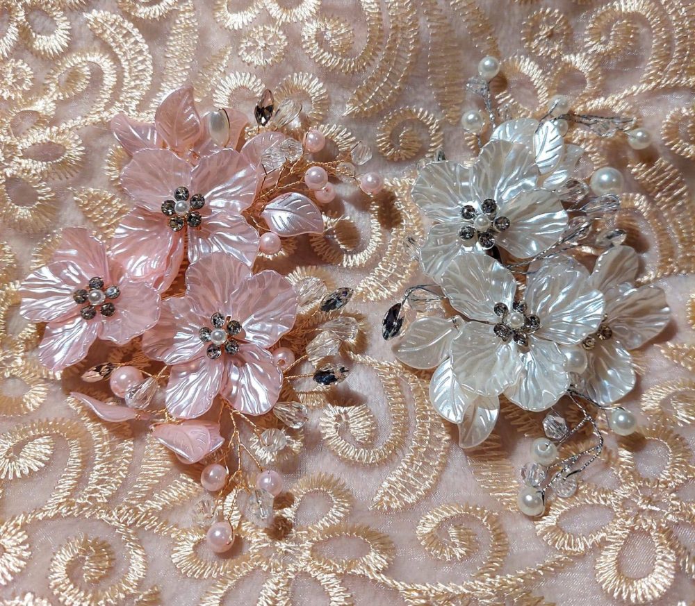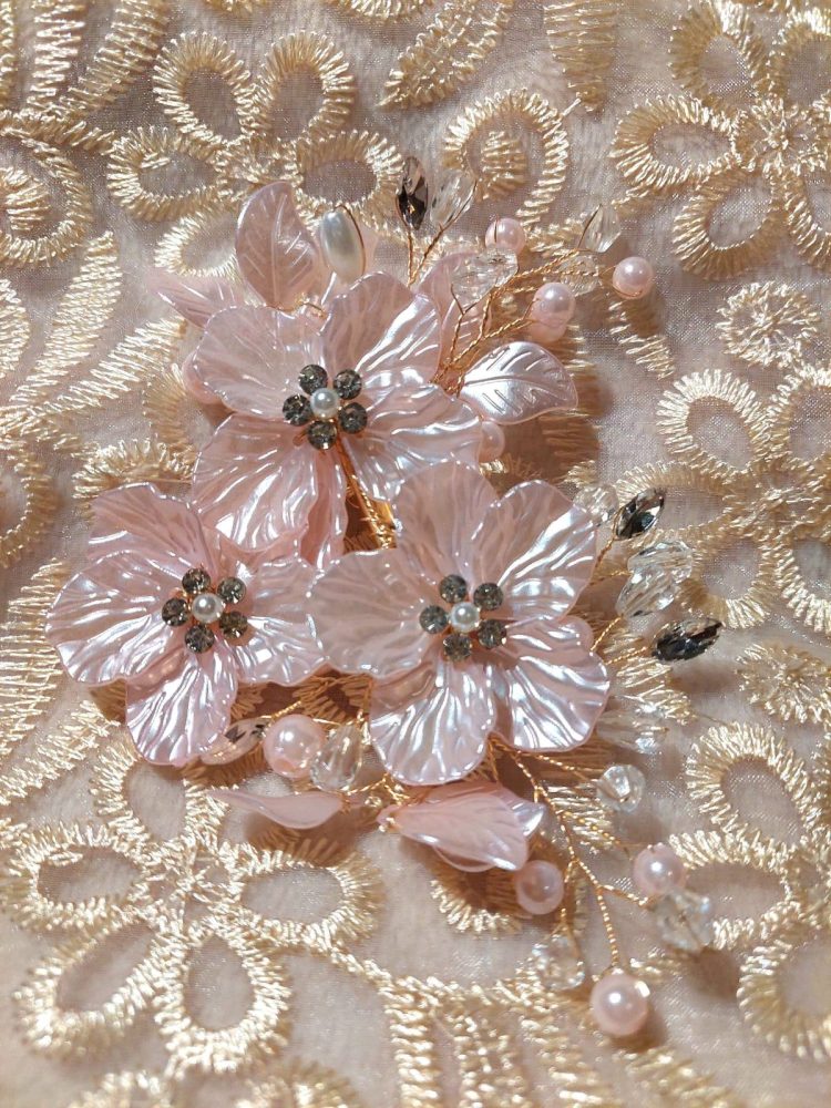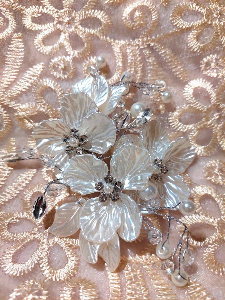 Hiuskoru on valmistettu kauniista helmiäisestä ja kukkien koristeena on kristalleja ja timantteja.