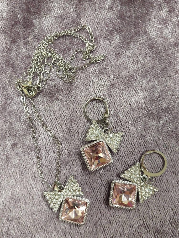 Kaunis Korusetti: Kaulakoru ja Korvakorut vaaleanpunaisella timantilla ja kristallisella Rusetilla