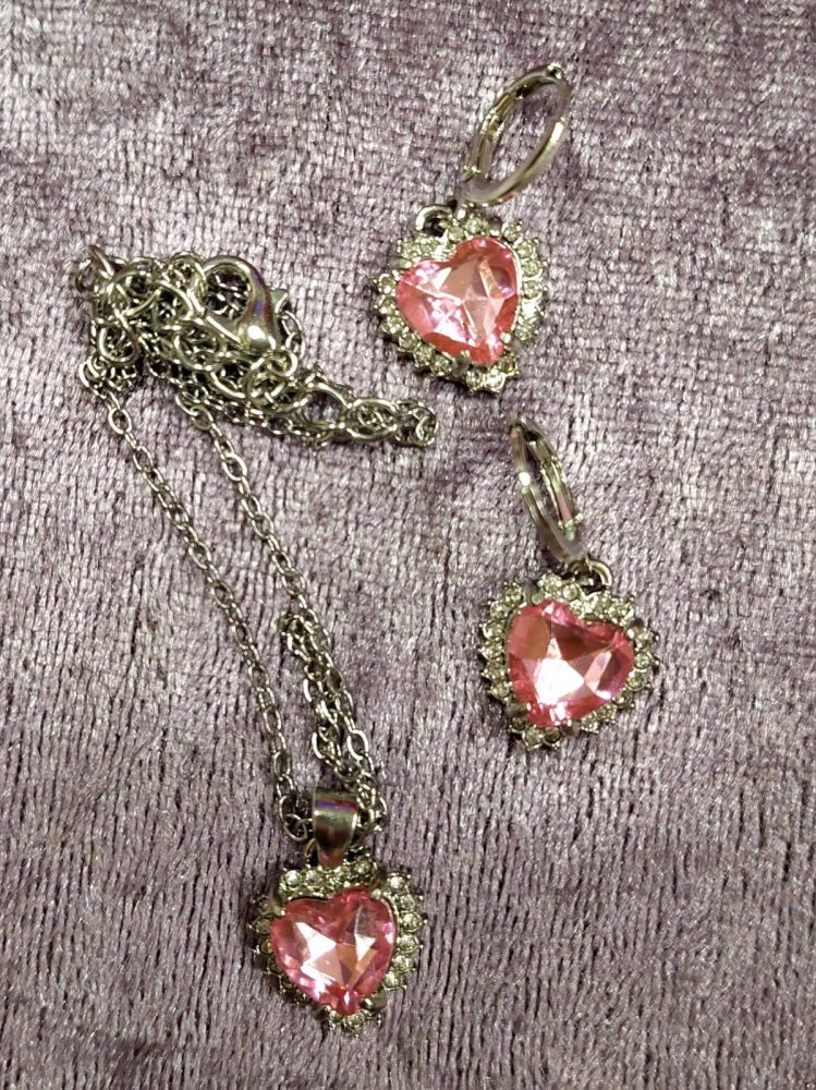 Kaunis Korusetti: Kaulakoru ja korvakorut Vaaleanpunaisilla kristallisilla Sydämillä