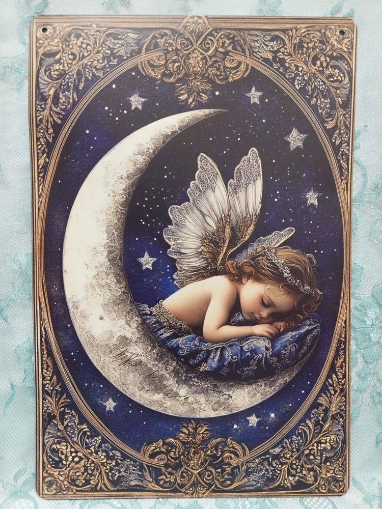 Kaunis kultakoristeltu Vintage -metallitaulut, Keiju kuunsirpillä, koko A4