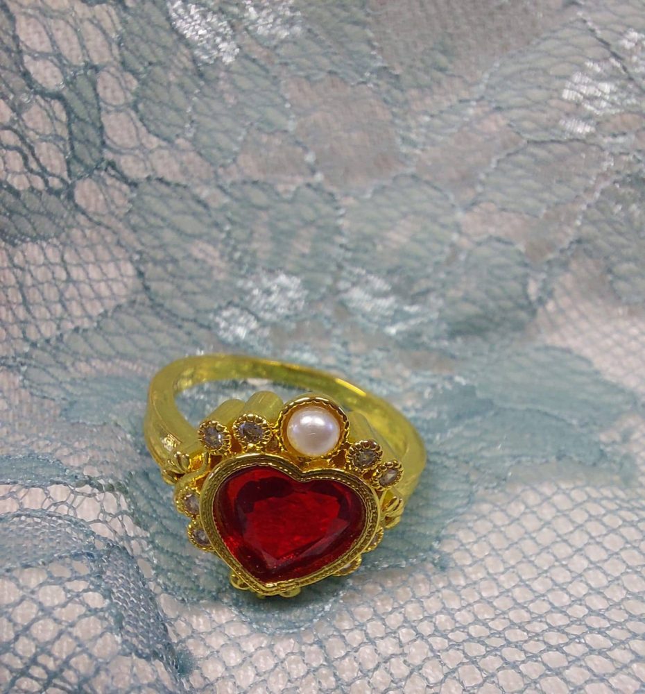 Kaunis, näyttävä sormus punaisella sydämellä ja helmellä.