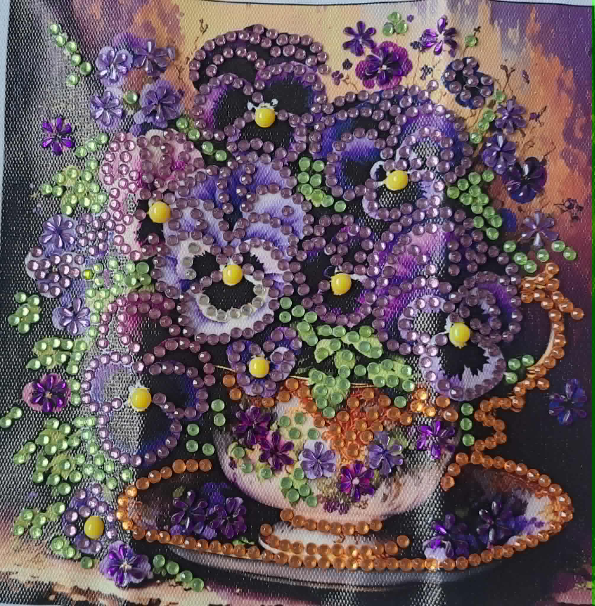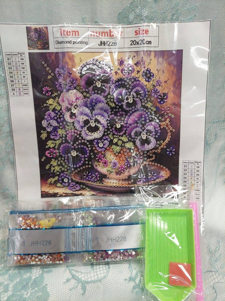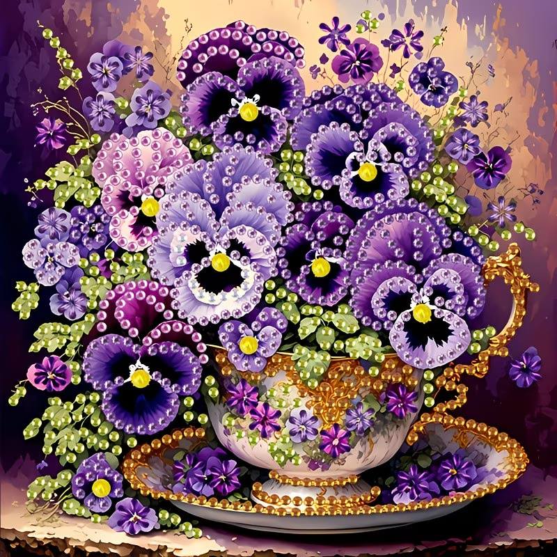 Kaunis Timanttihelmityö, Orvokit kupissa, 20 x 20 cm