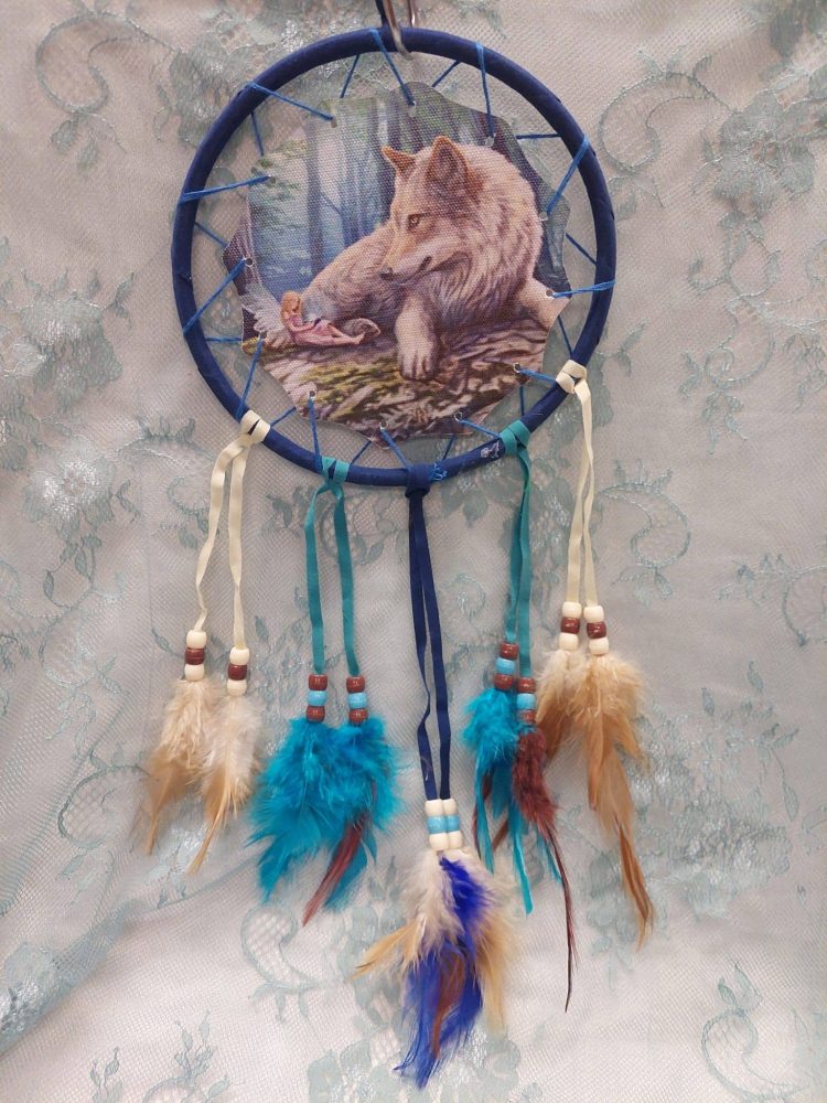 Tummanpunaisella tekstiilillä päällystetty kehä. Kuvassa susi ja keiju metsämaisemassa.