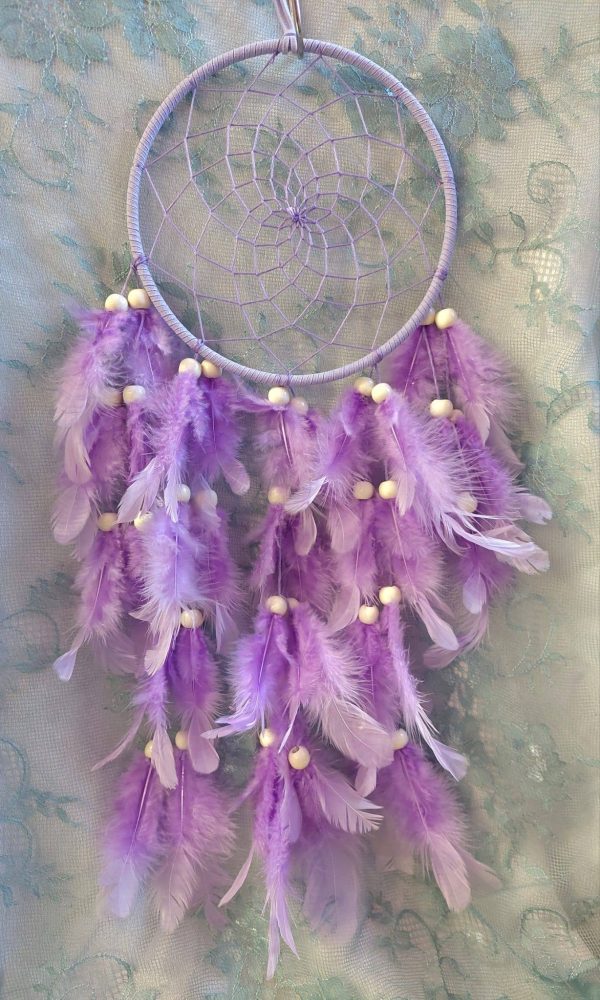 KAUNIS VAALEN LILA UNISIEPPARI TUUHEILLA HÖYHENILLÄ JA HELMILLÄ