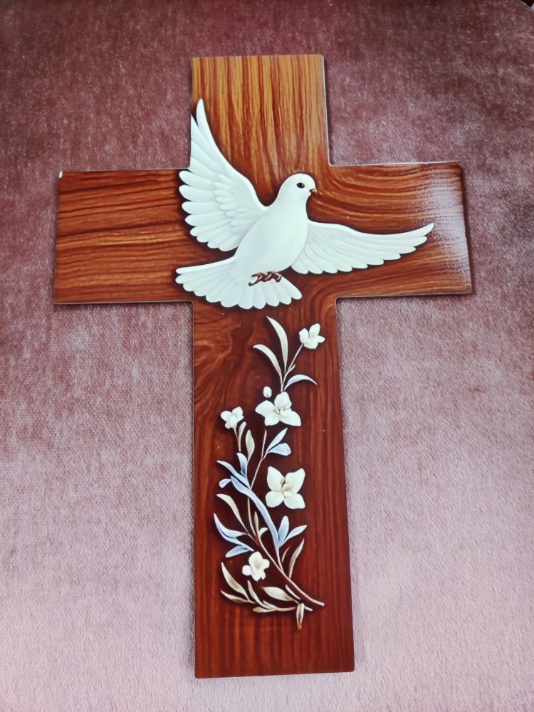 Kaunis valkoinen krusifiksi tuo rauhallisen tunnelman.