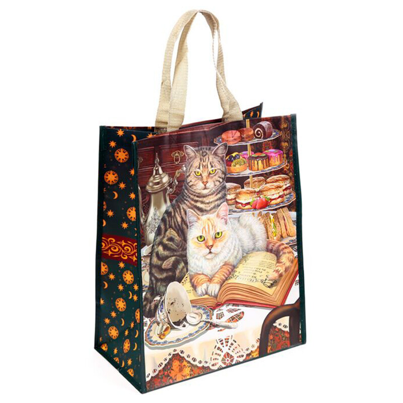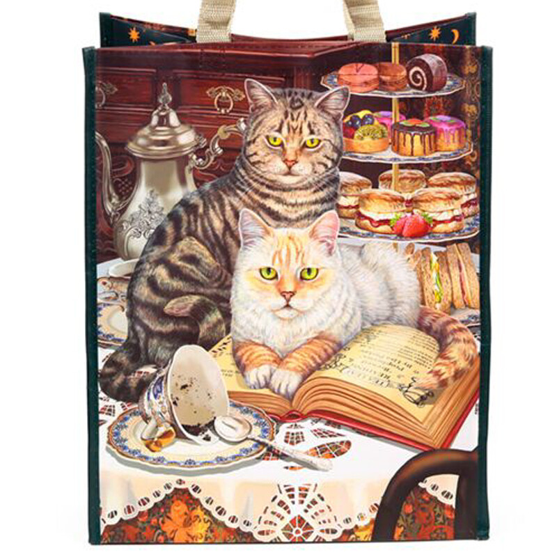 Kestävä kassi, jonka kuvitus on persoonallinen ja mystinen ja sisältää paljon yksityiskohtia.