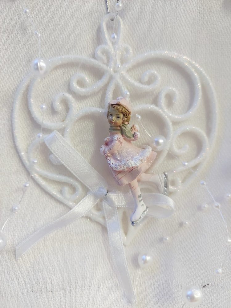 Kaunis lumikide- sydänkoriste, jossa vanhanajan luisteleva tyttö.