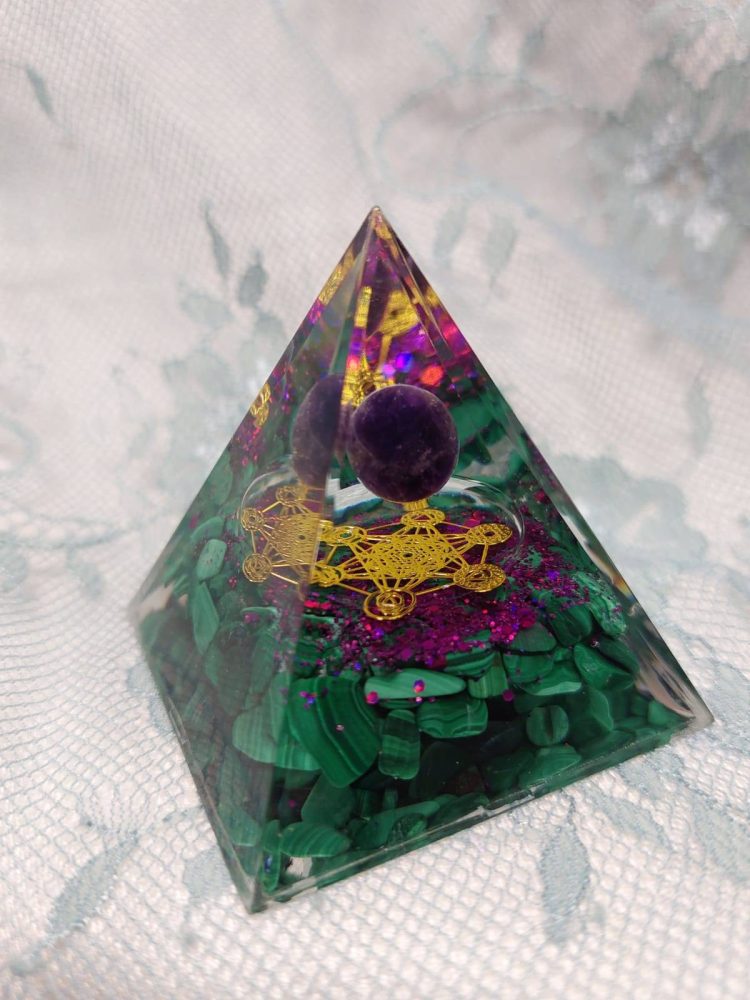 Orgoniitti-pyramidi symboleilla, Aventuriini, Ametisti-kuula, 6 cm