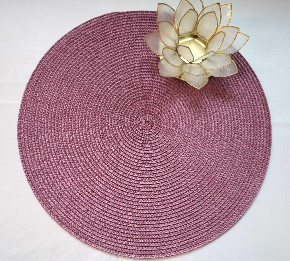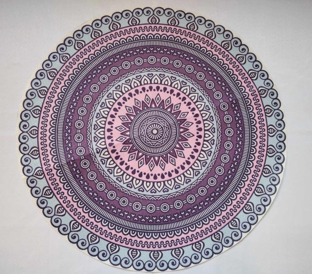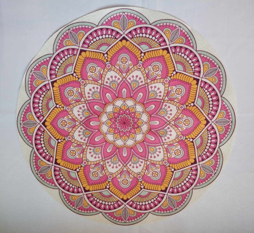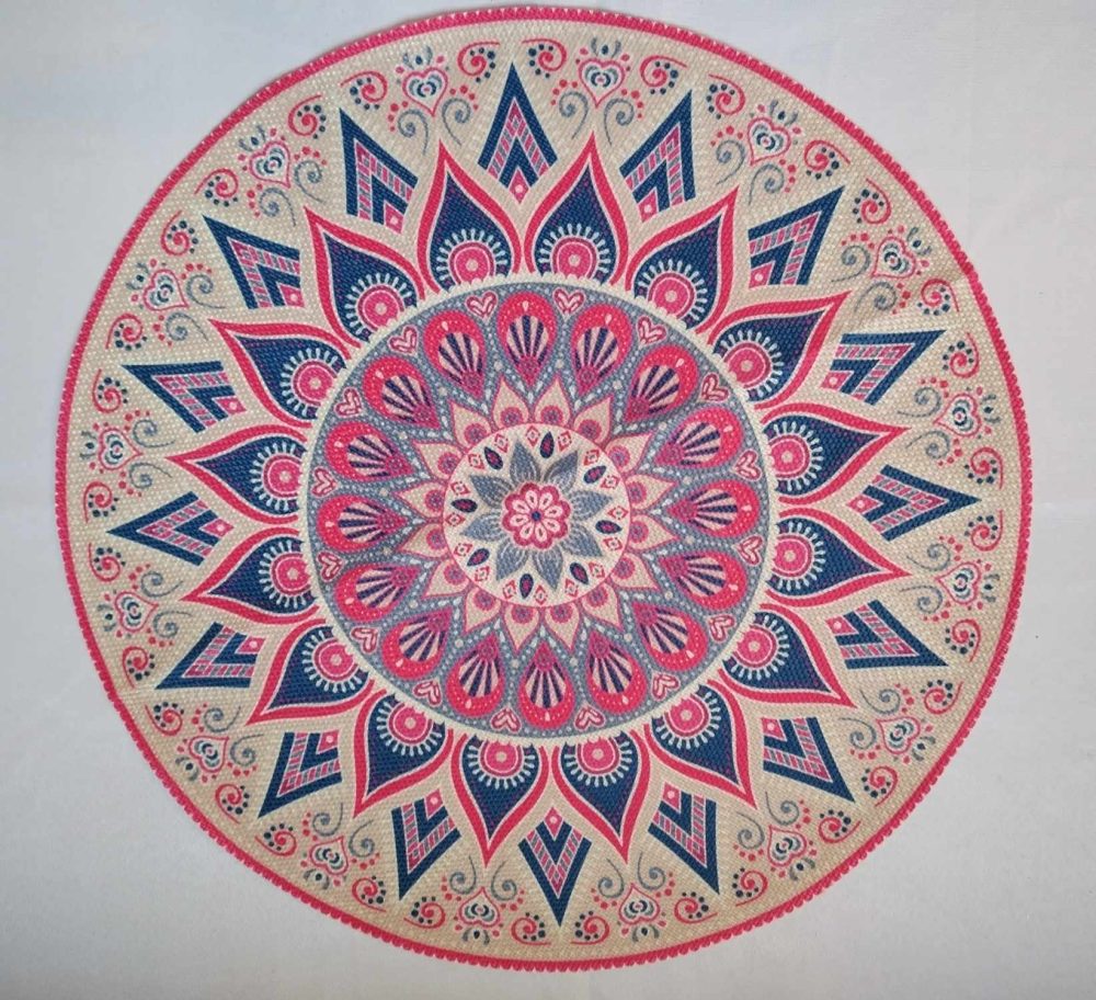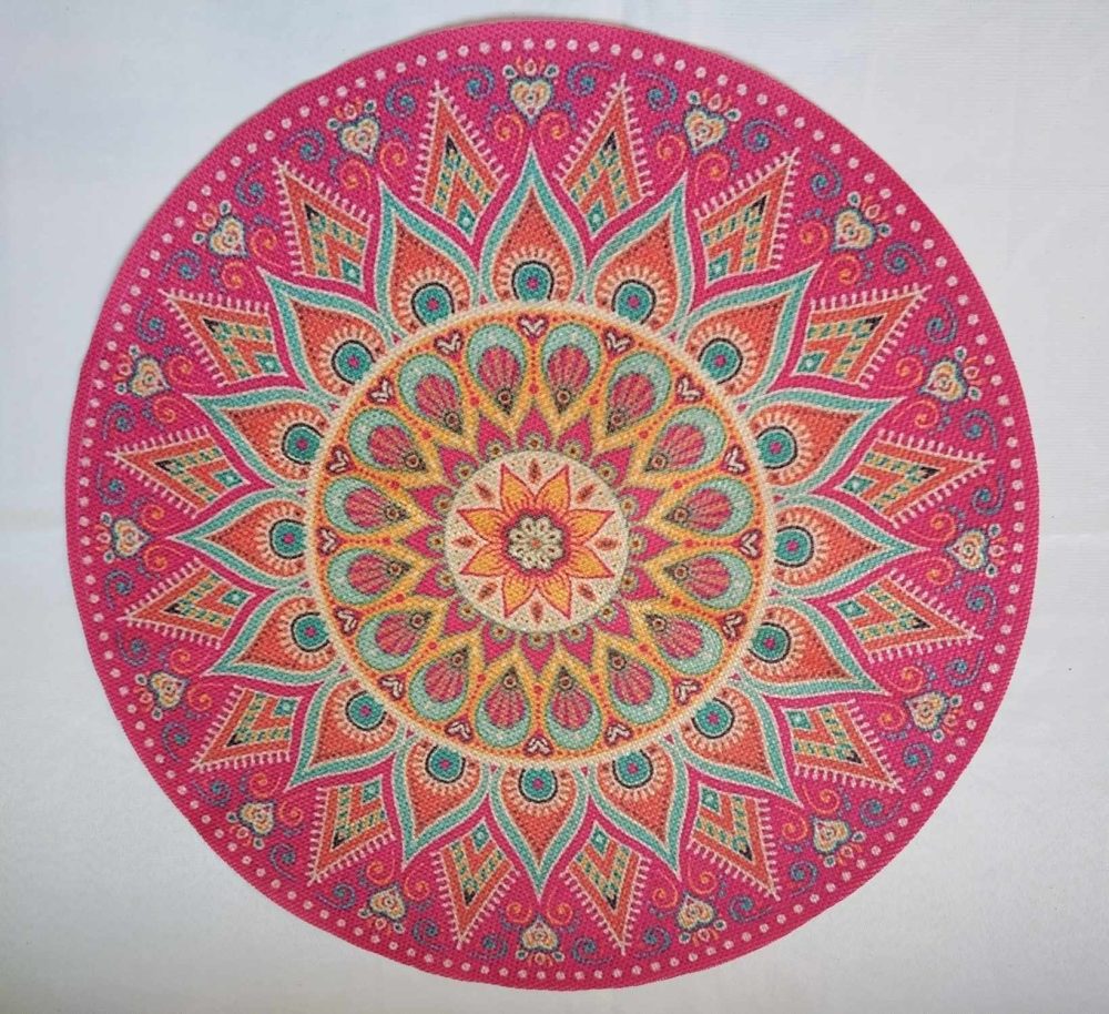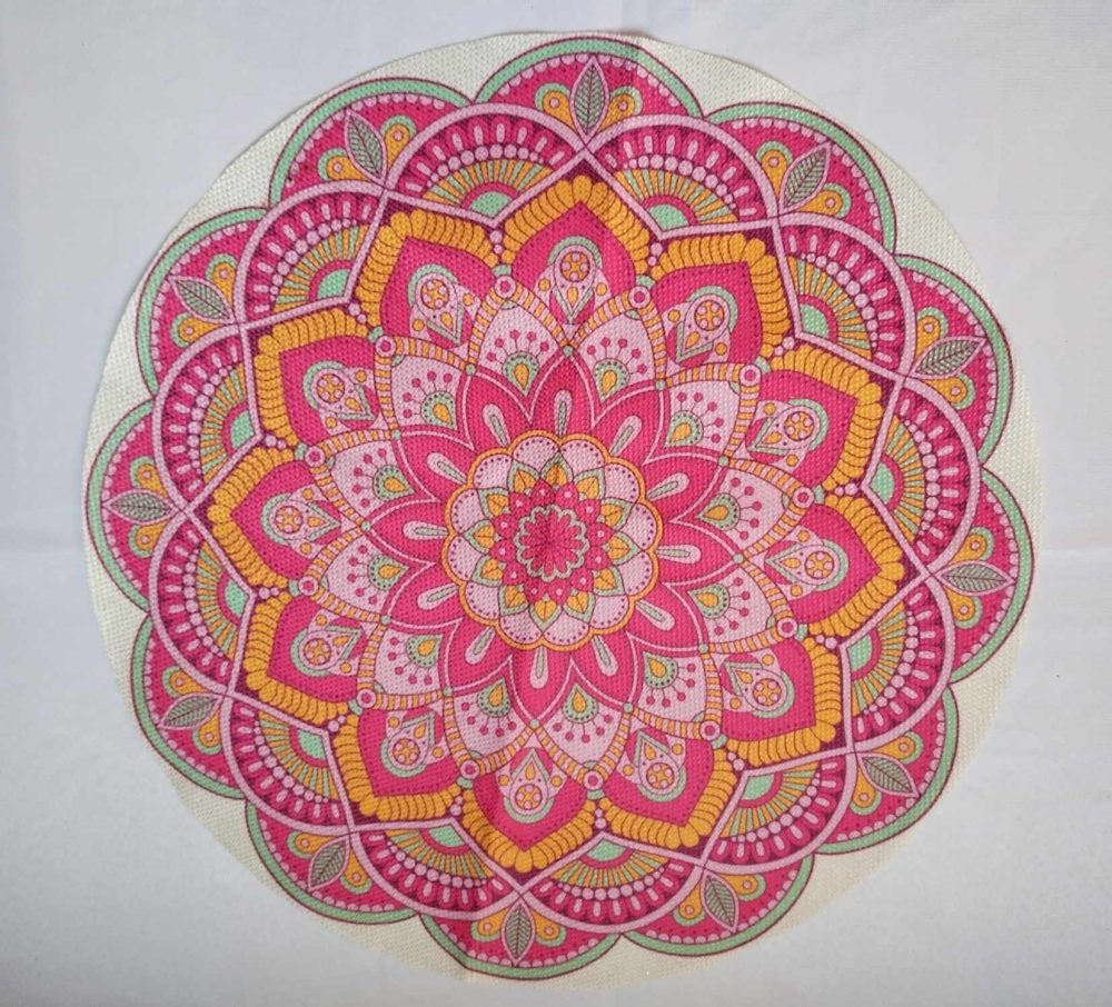 Pellavainen liina/ tabletti, ”Vaaleanpunaisen sävyt Mandala”, pyöreä, halkaisija n. 37 cm