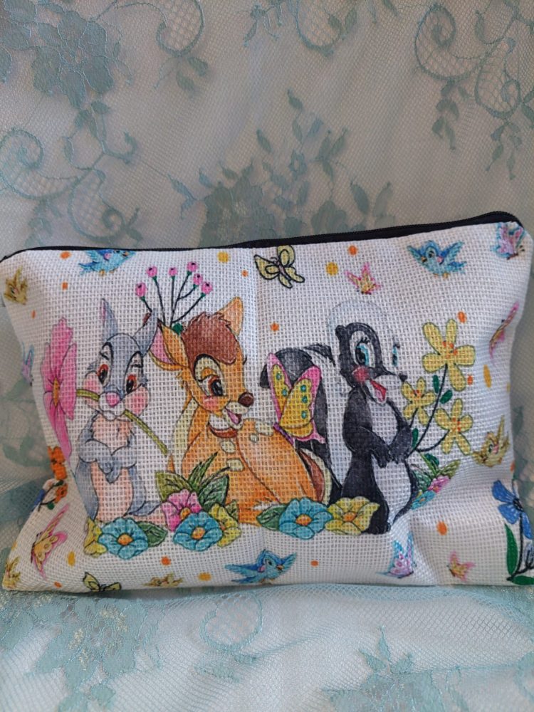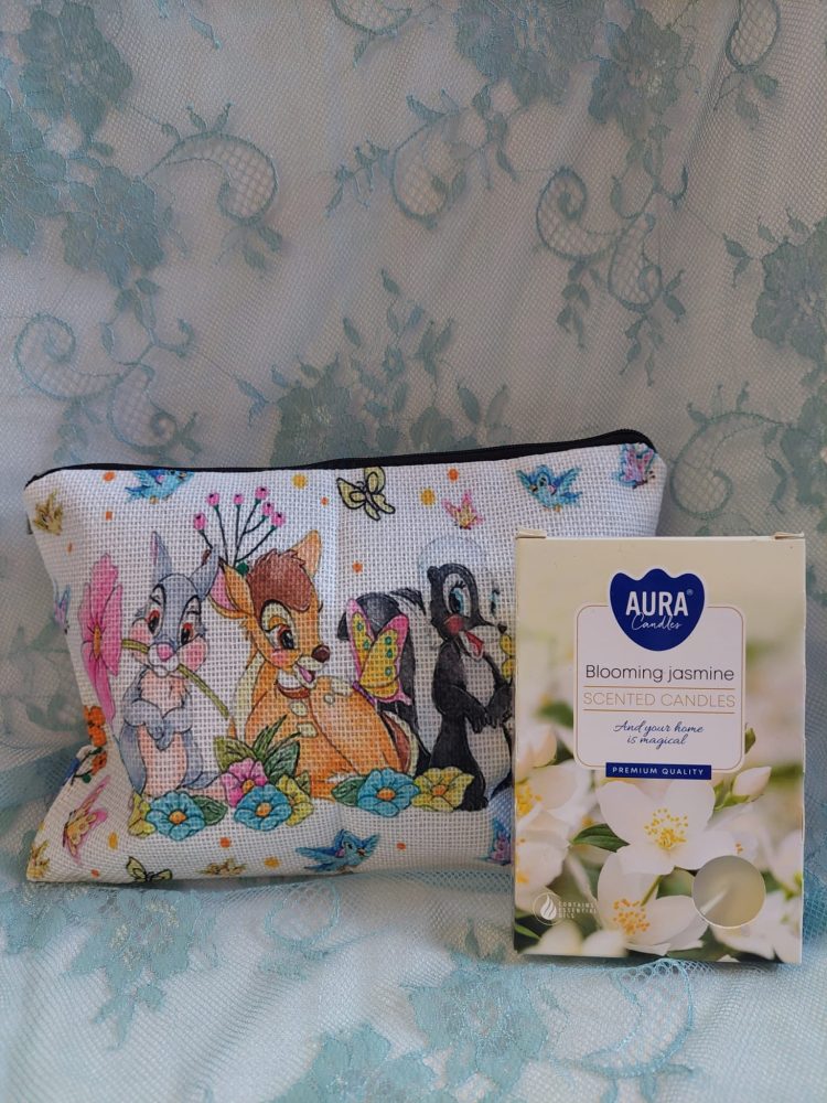 Kauniisti kuvitettu vetoketjullinen kosmetiikkalaukku käy moneen tarpeeseen.