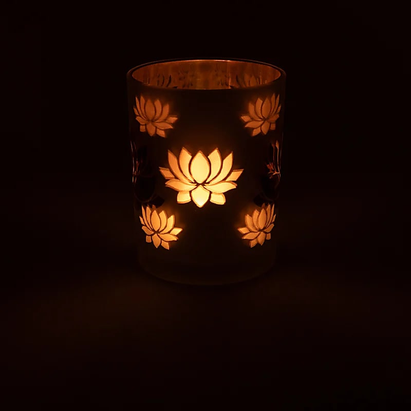 LOTUSLYHTY, jossa sisäpuoli on ruusukultaa ja ulkopuoli paksua lasia, josta Lotuksen läpi loistaa valo kauniisti ottaen heijastusta sisäpinnasta.