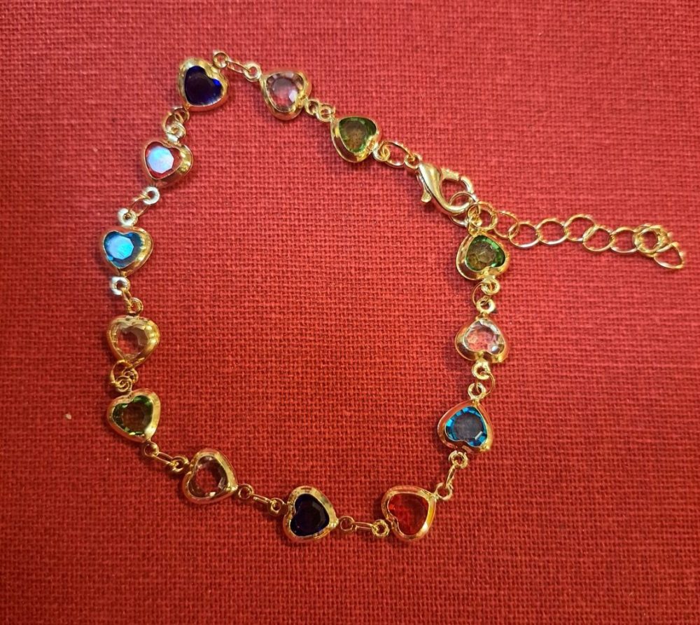 Kaunis, näyttävä ranneketju värikkäällä sydän-timanttirivistöllä.