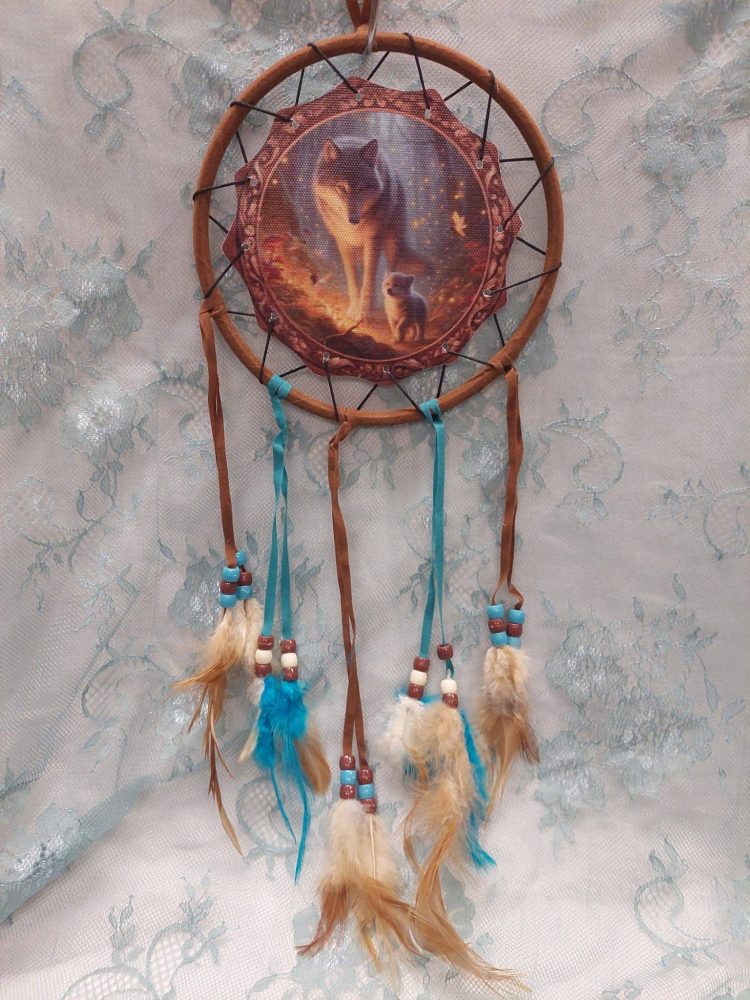 Ruskealla tekstiilillä päällystetty kehä. Kuvassa susi ja poikanen.