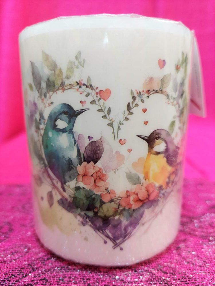 Kynttilän pinnassa on kaunis kuva-aihe, sisältä kynttilä on puhtaan valkoinen.