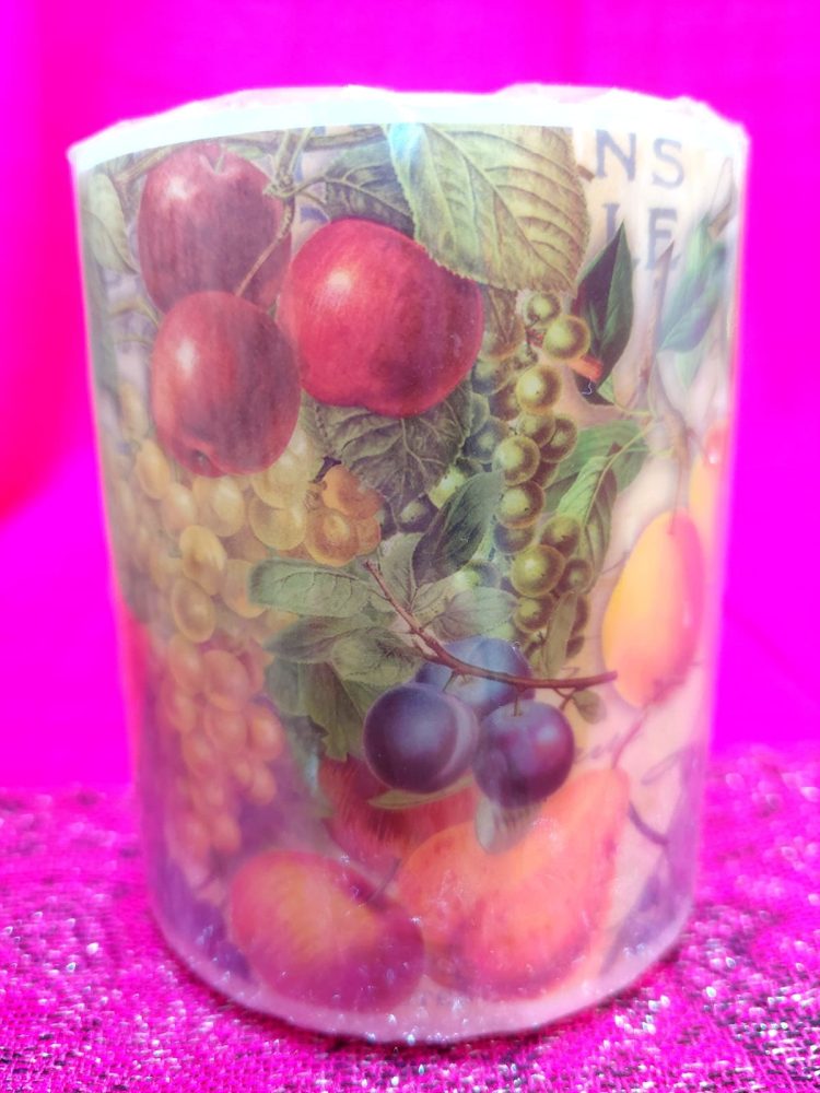Kynttilän pinnassa on kaunis kuva-aihe, sisältä kynttilä on puhtaan valkoinen.