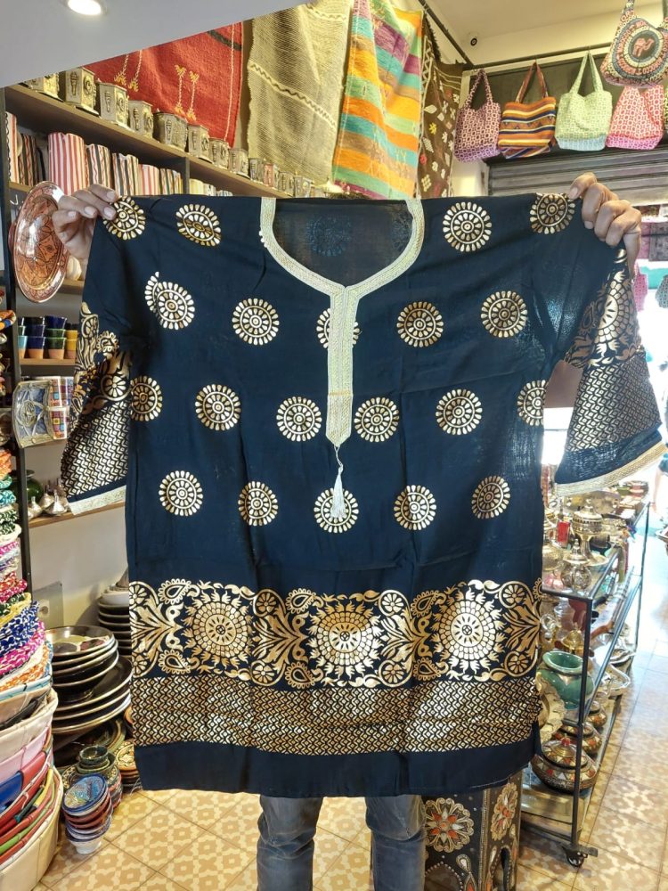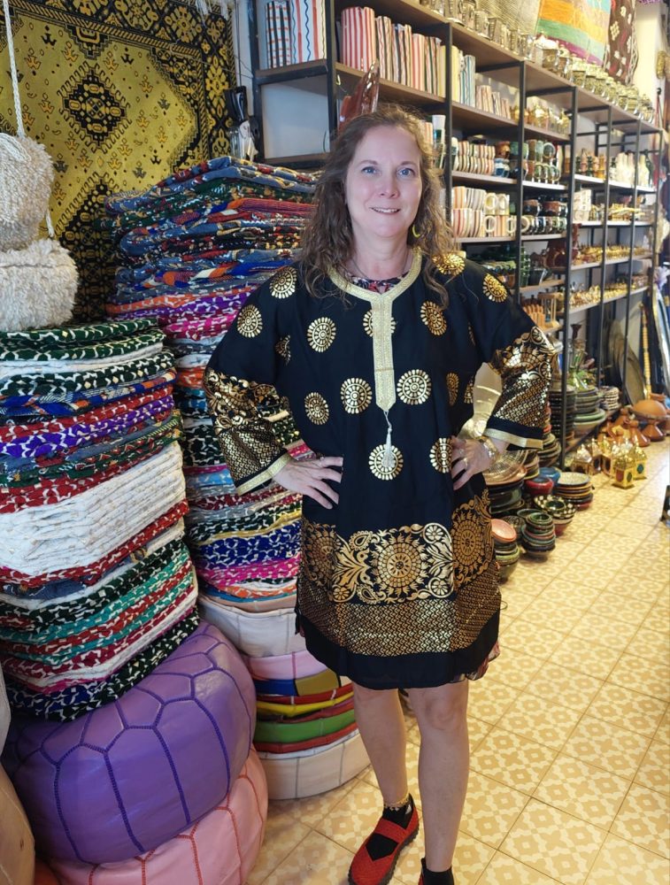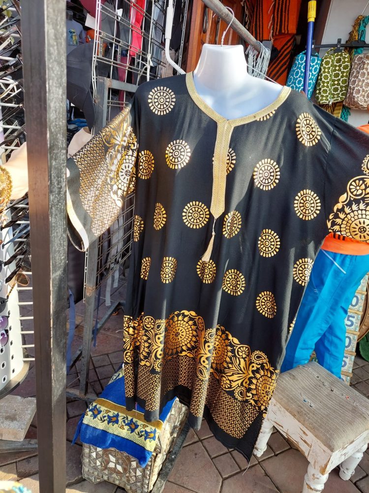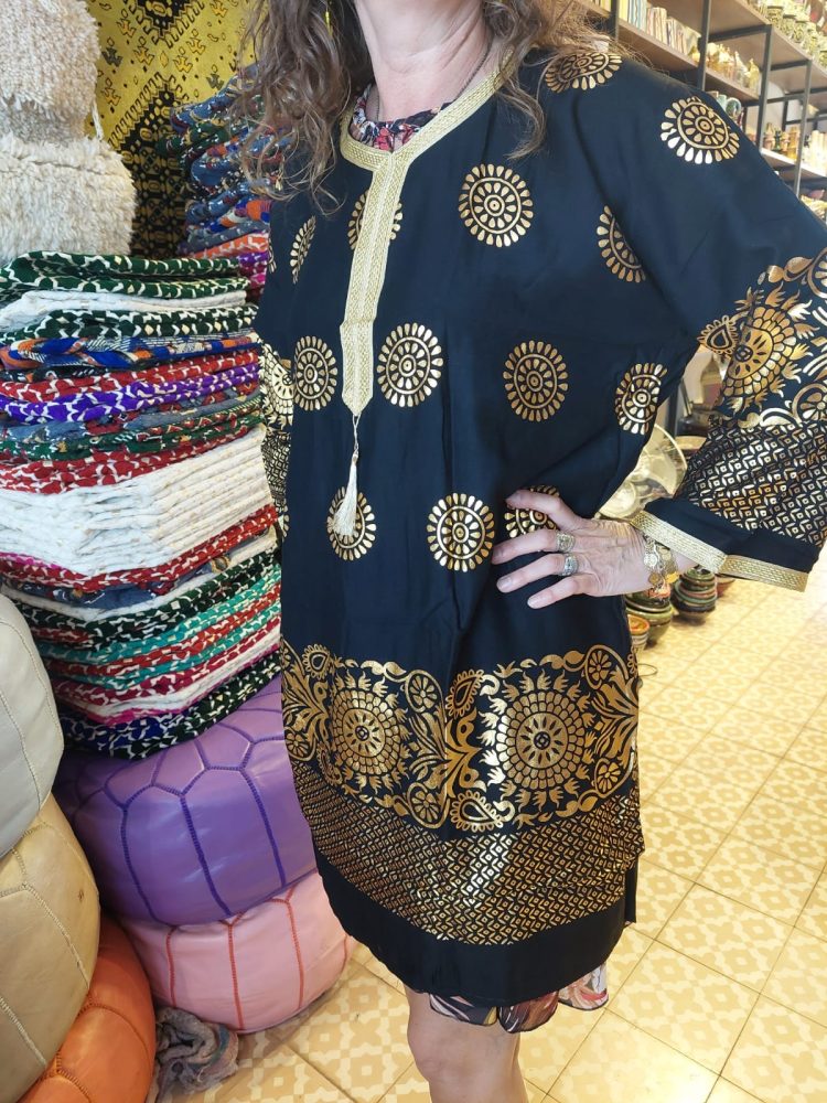 Marokon tunika on koristeltu upeasti kullan sävyillä; edestä, takaa ja myös hihat.