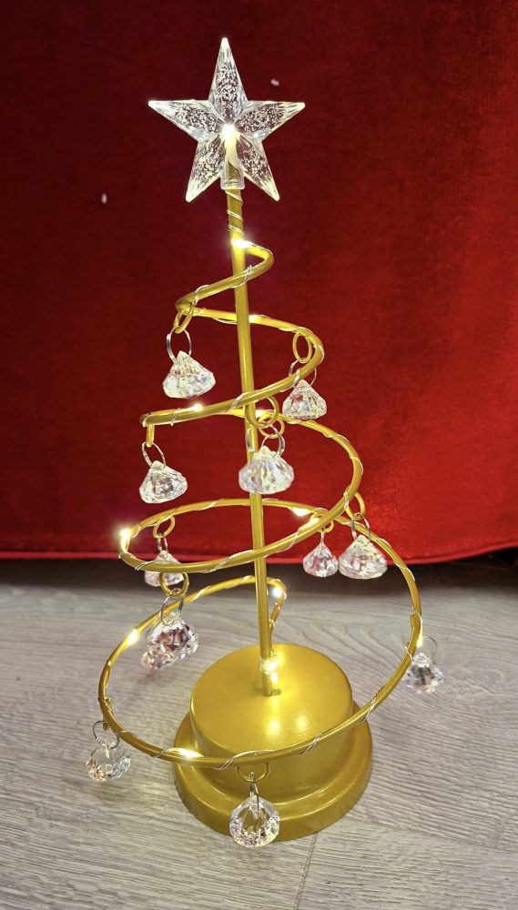 Metallinen kultainen kierrekuusi on koristeltu kristalleilla ja led-valolla.